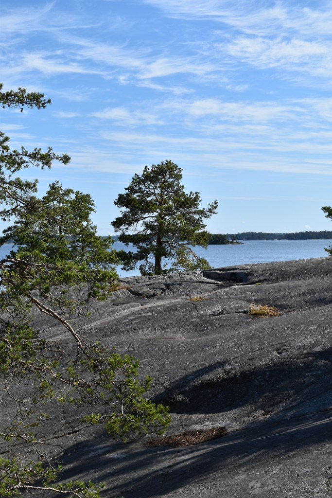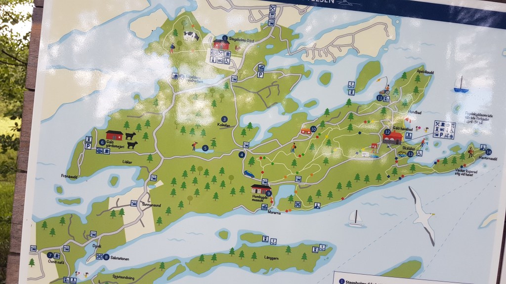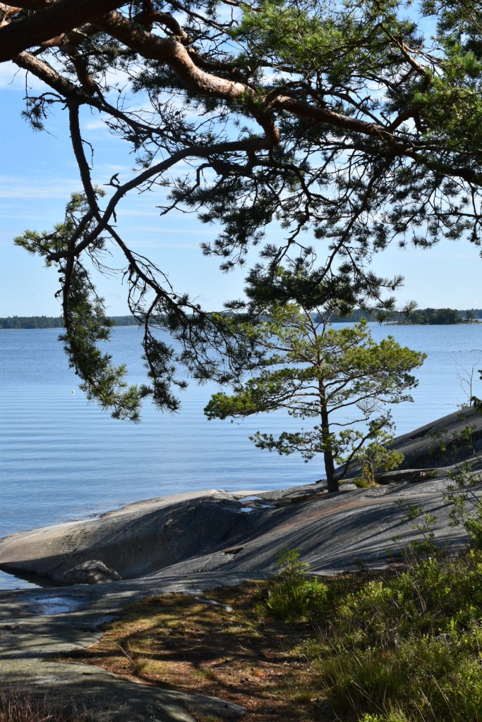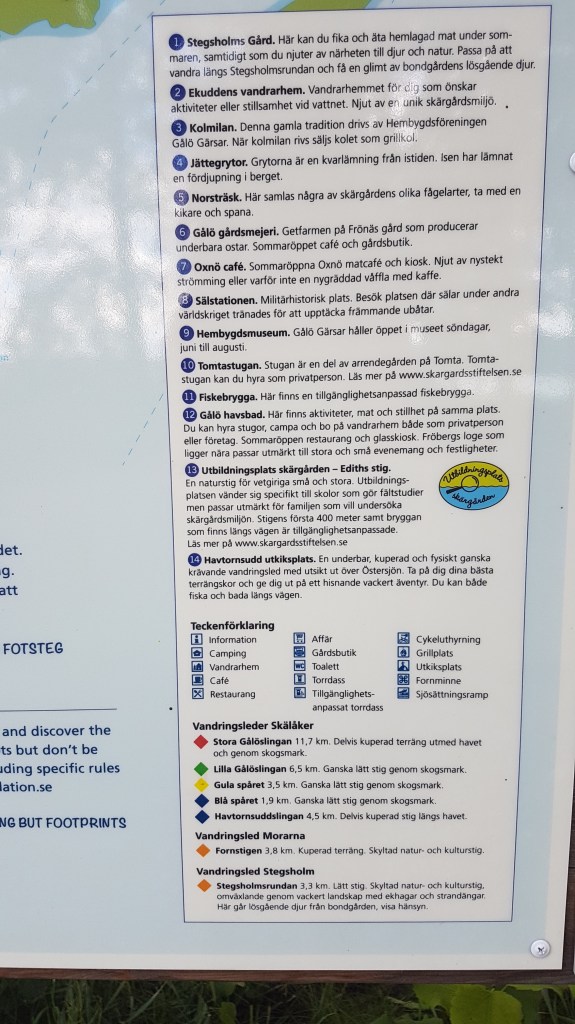 Gålö erbjöd flera fina vandringsalternativ, jag kombinerade Fornstigen och Havtornsslingan. Fantastiskt vackert med tallar, klipphällar, utsiktsberg och småstensstrand. Det var kuperat med ojämnt underlag så ett par skor med ordentlig sula är att föredra. Glöm inte vattenflaskan.