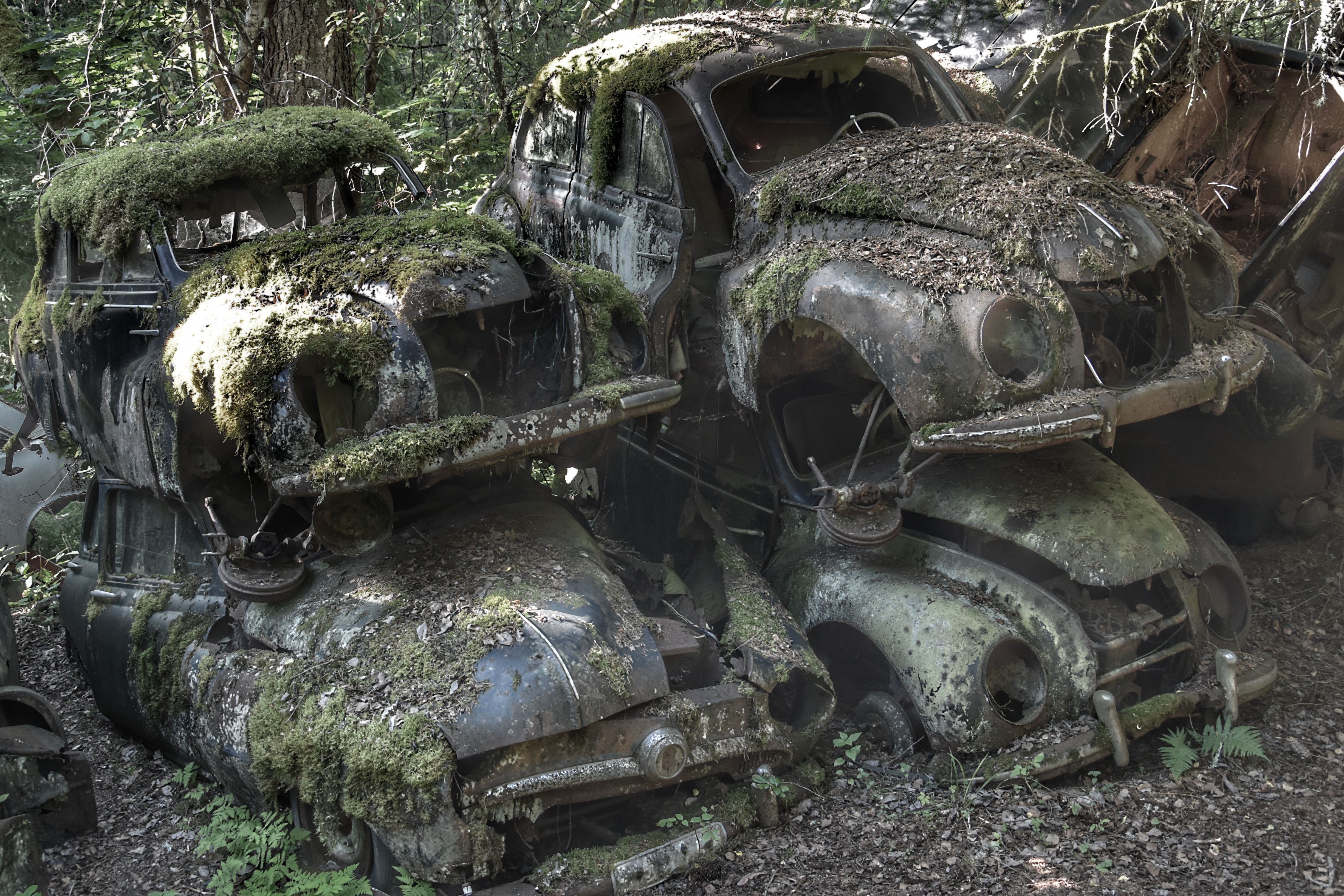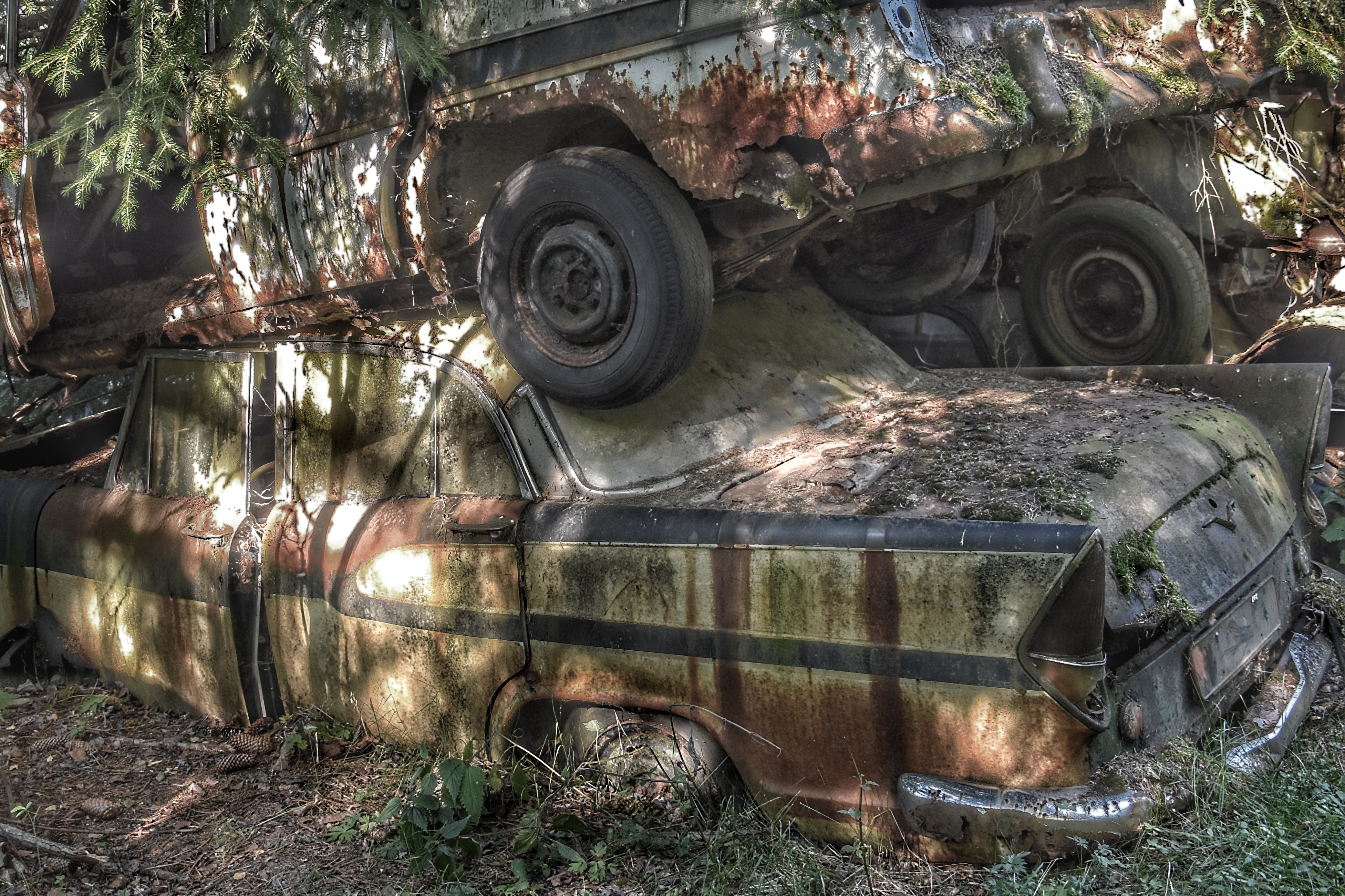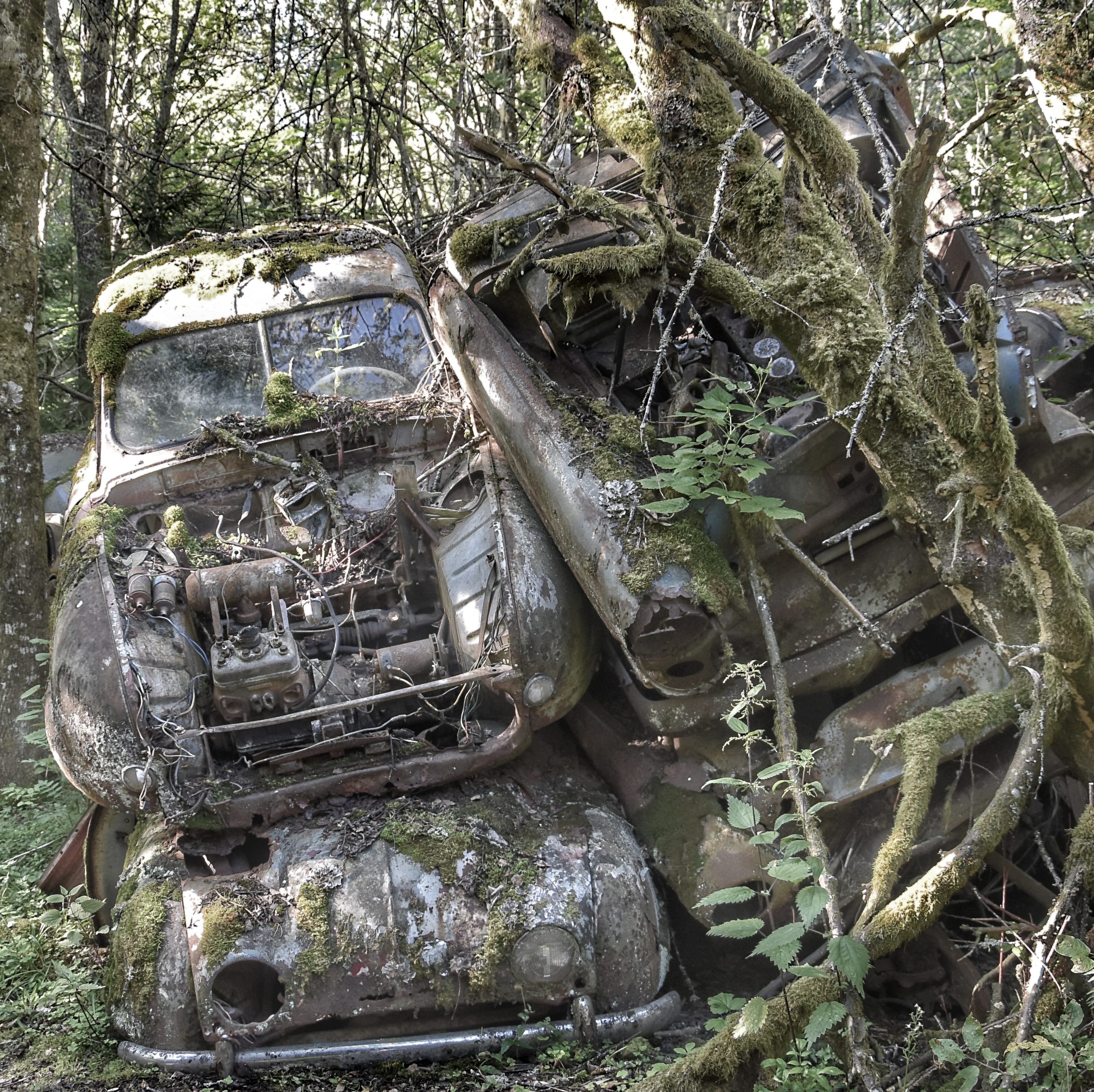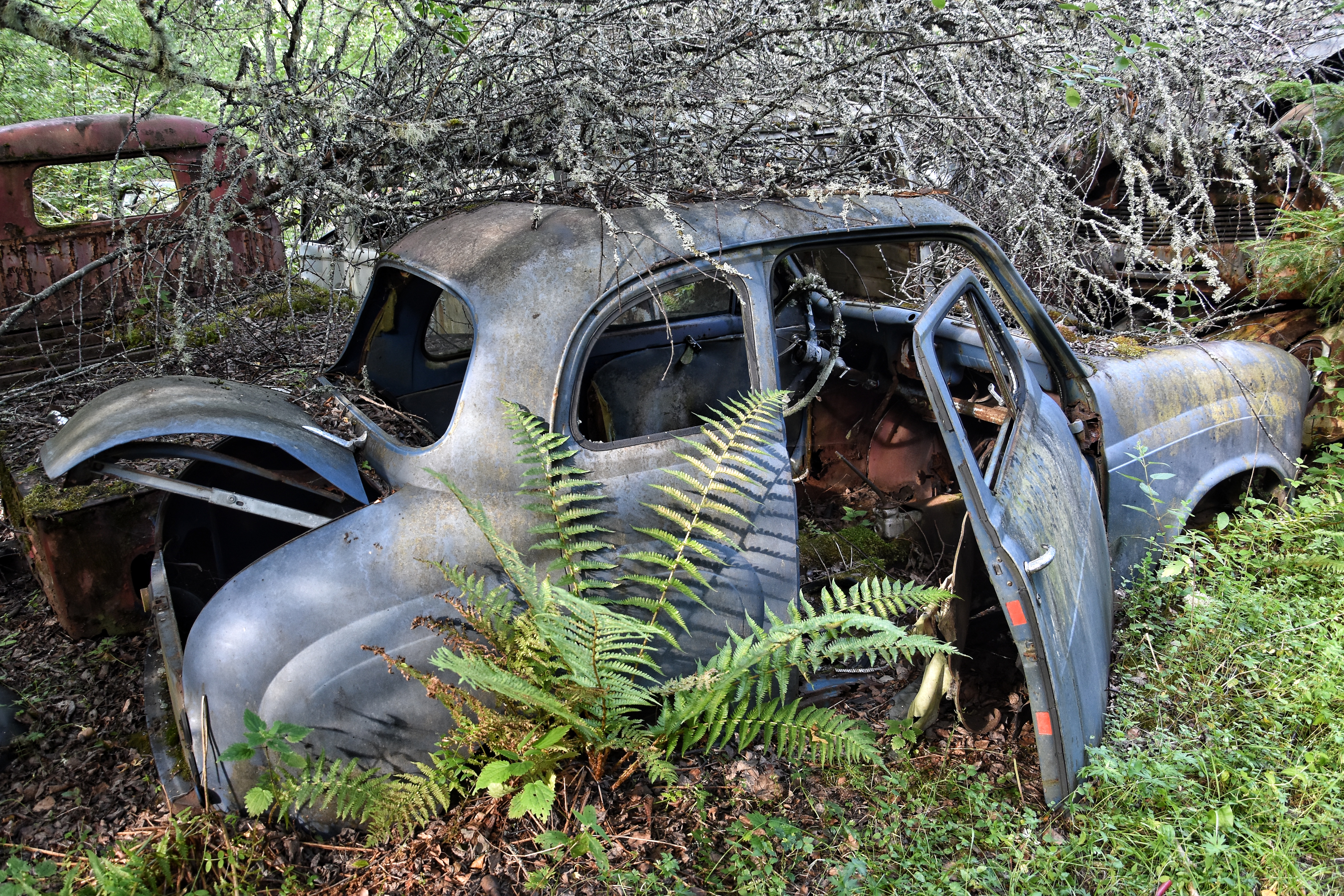 Jag hade dock ett problem vid bilkyrkogården – det skarpa ljuset. Den första turen dit gjorde jag på morgonen. Solen stod högt på en klarblå himmel redan då, och de flesta av bilarna befann sig i skugga eller halvskugga. Det blev för skarpa kontraster. I alla fall för mig. Solstrålar sken in mellan bladverken och då har jag svårt att få till bilder.