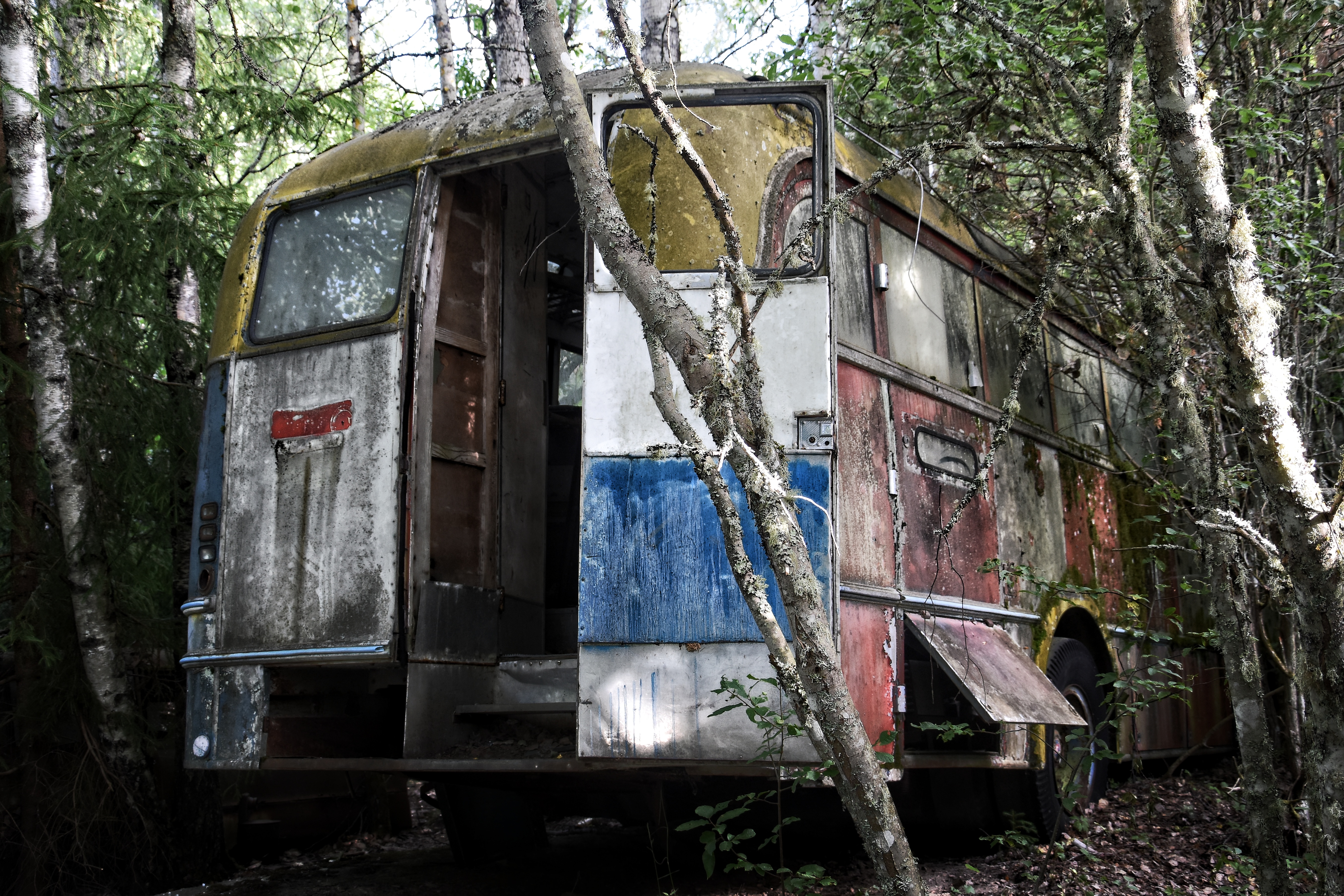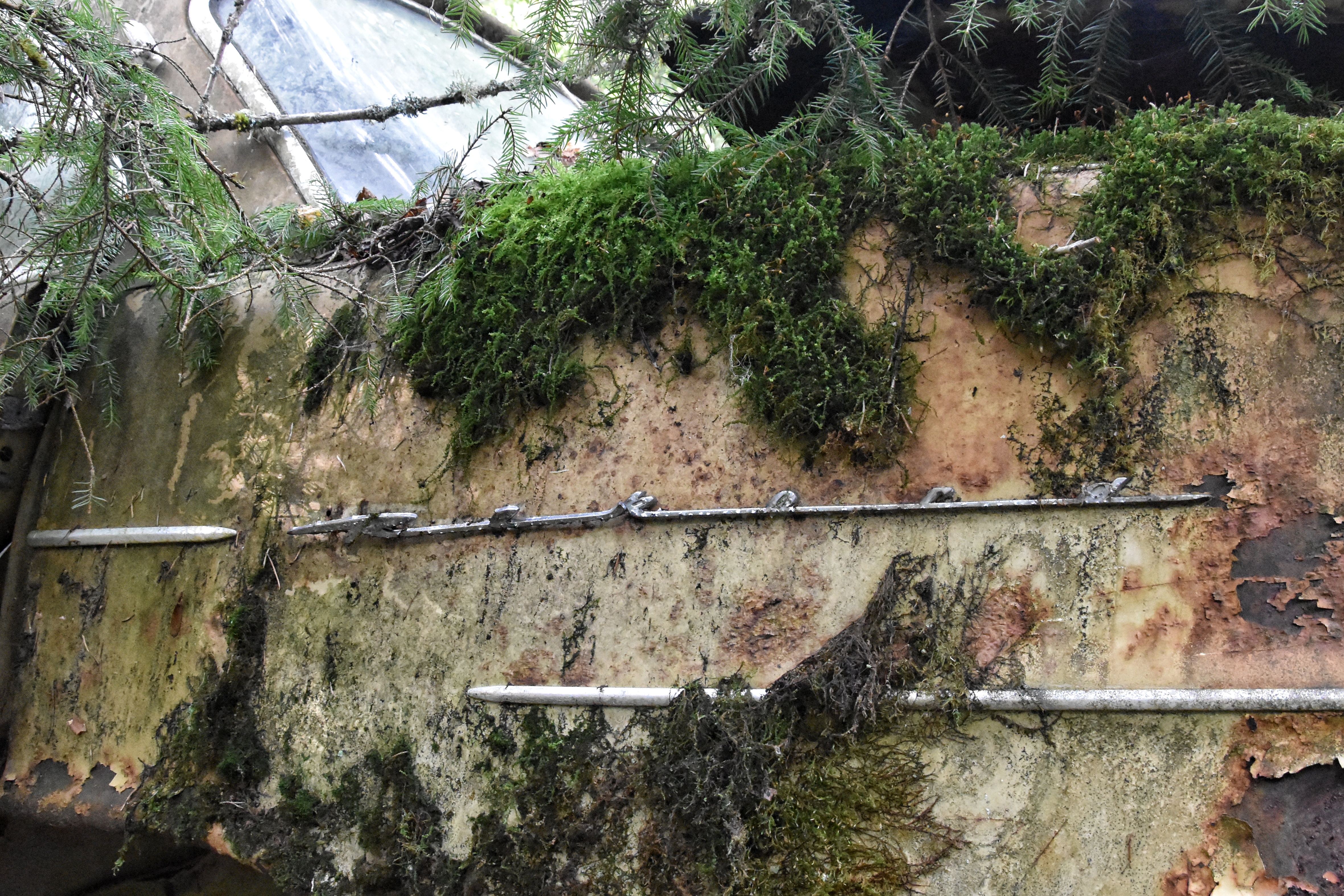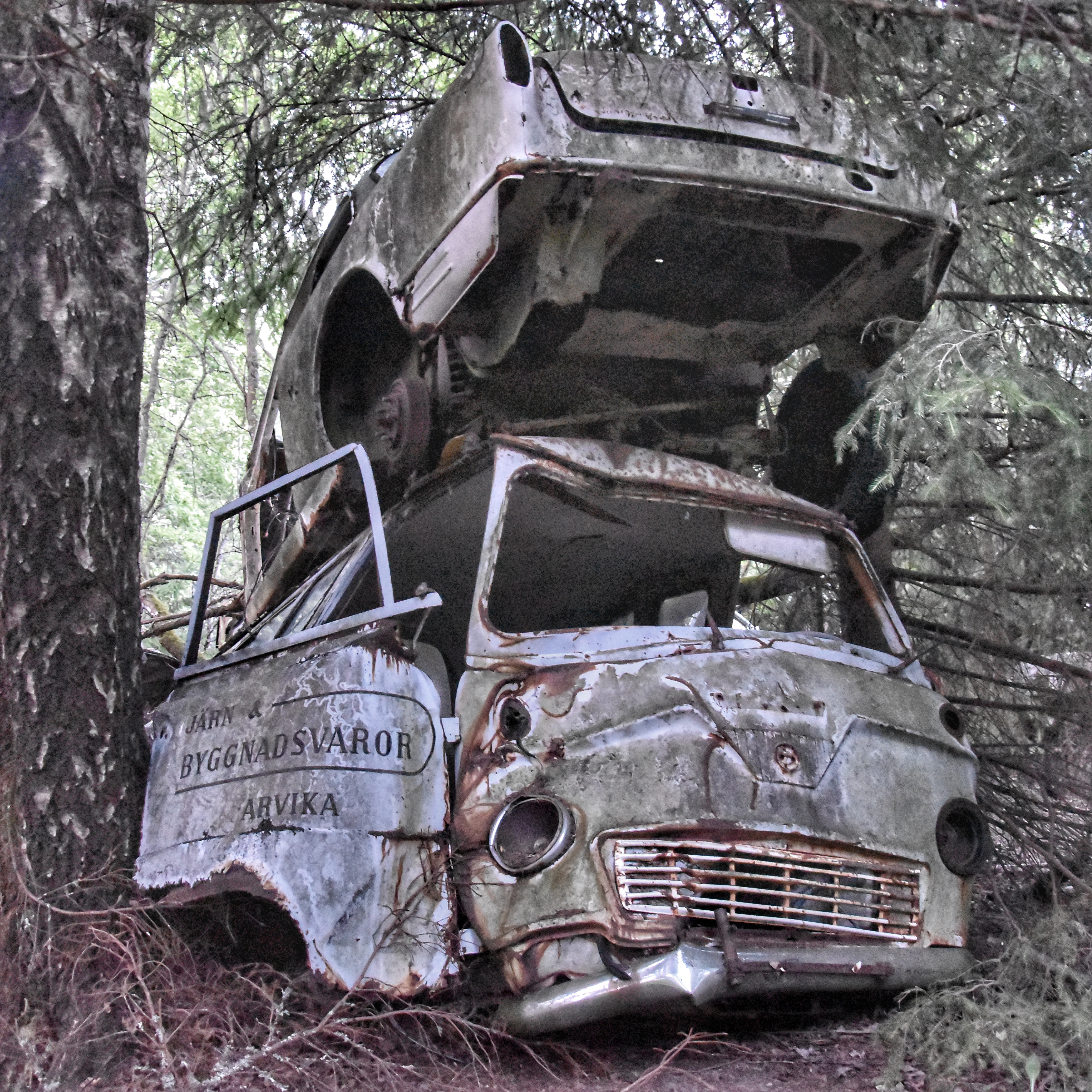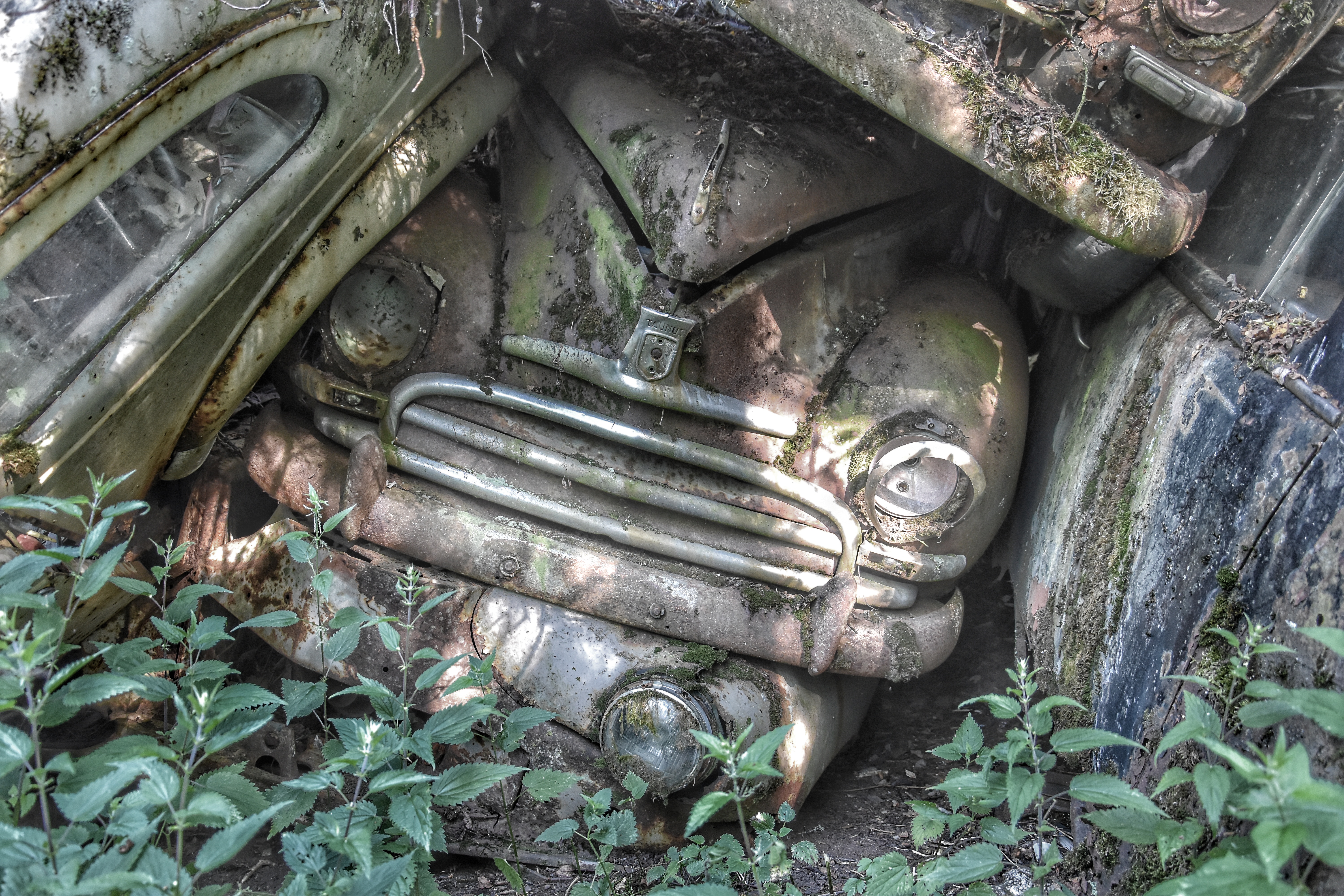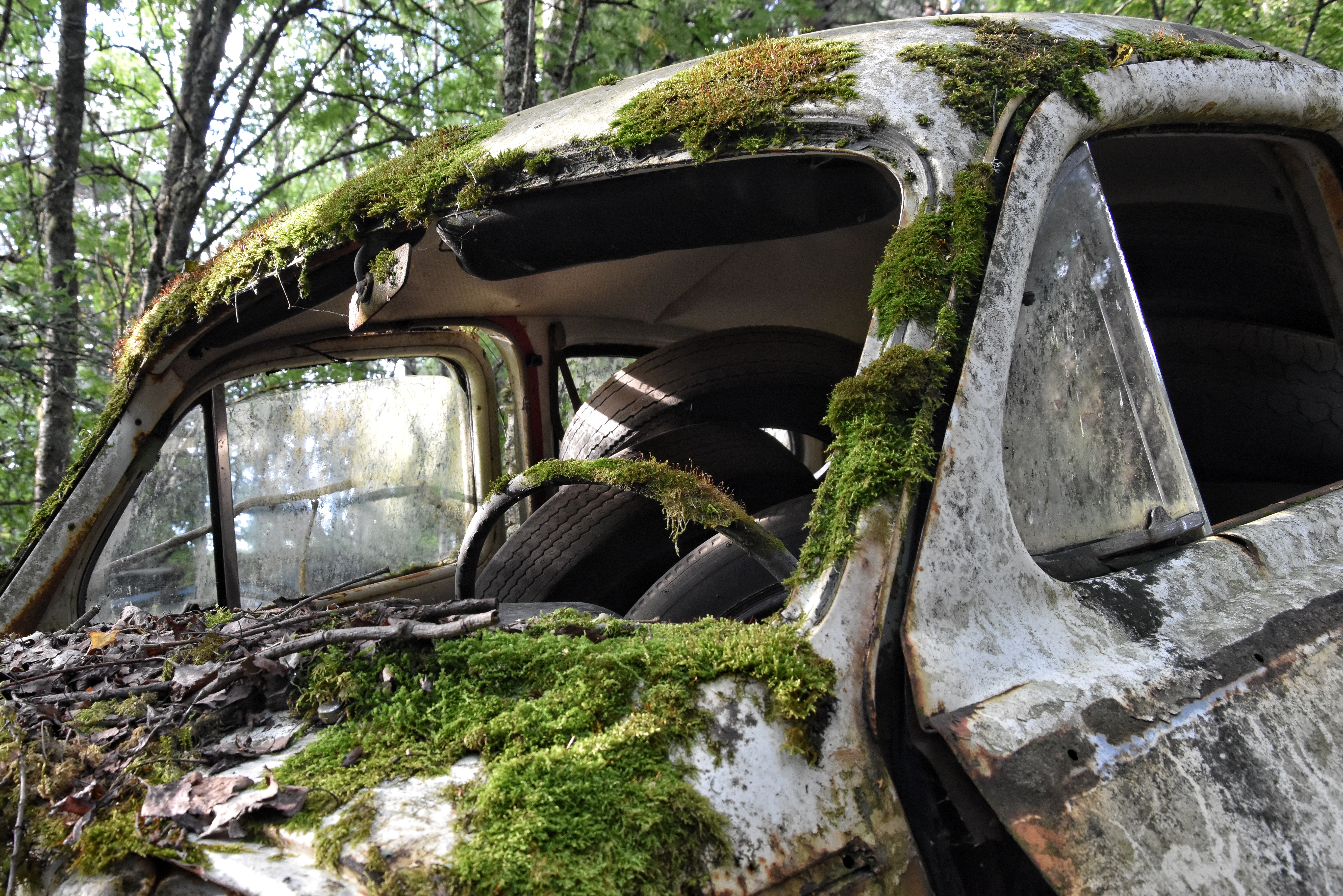 Jag hade dock ett problem vid bilkyrkogården – det skarpa ljuset. Den första turen dit gjorde jag på morgonen. Solen stod högt på en klarblå himmel redan då, och de flesta av bilarna befann sig i skugga eller halvskugga. Det blev för skarpa kontraster. I alla fall för mig. Solstrålar sken in mellan bladverken och då har jag svårt att få till bilder.