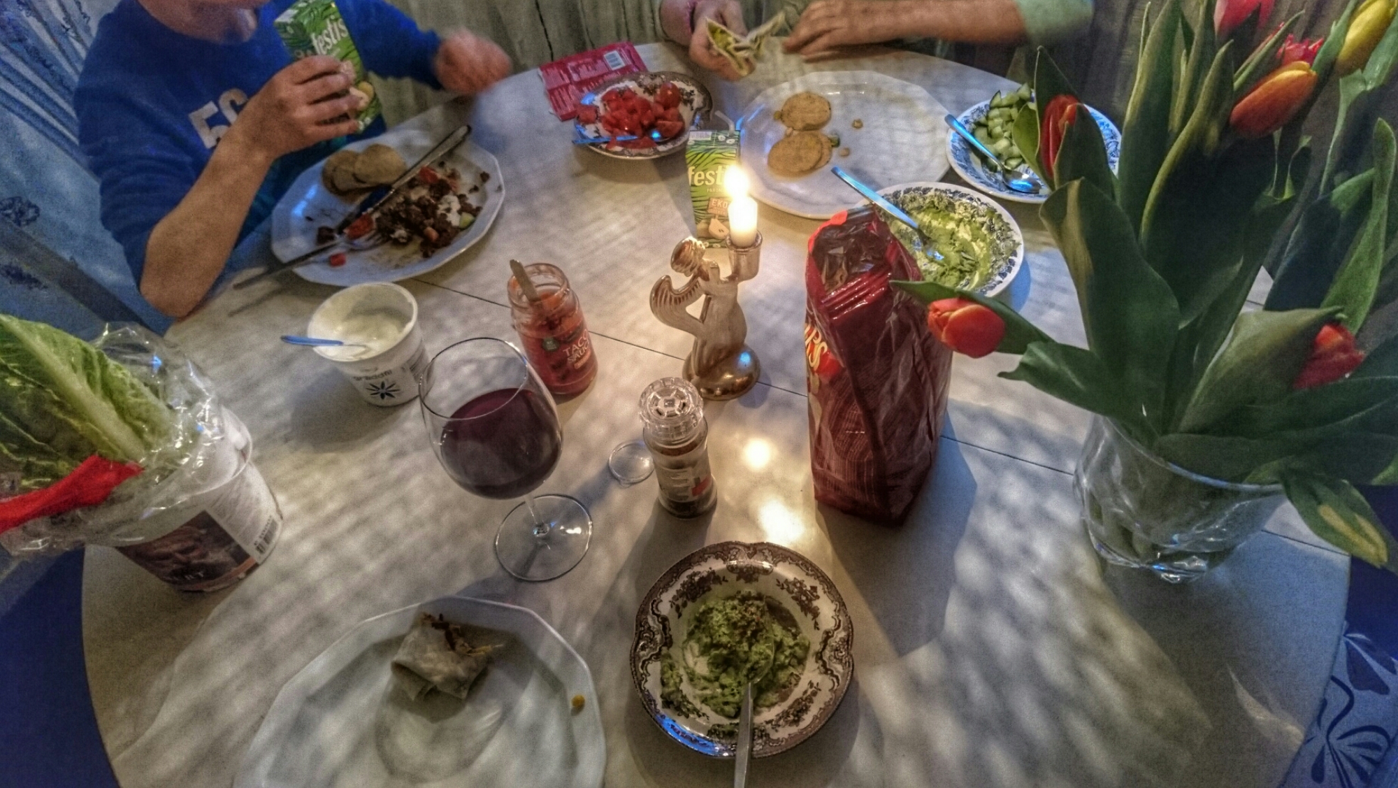 My contribution to WP’s Photo challenge: Small but coluourful dinner at the summer house. Corn, haloumi, basil, pickle, tomato, onion, lettuce, spicy guacamole – all musts on my homemade burger.
