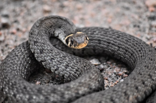 This time a Grass snake. When I turned on my towel it made a U-turn (just as the Viper yesterday) and dived into the sea. He was 20 centimeters from my nose. I think that is called “Close Encounter”.