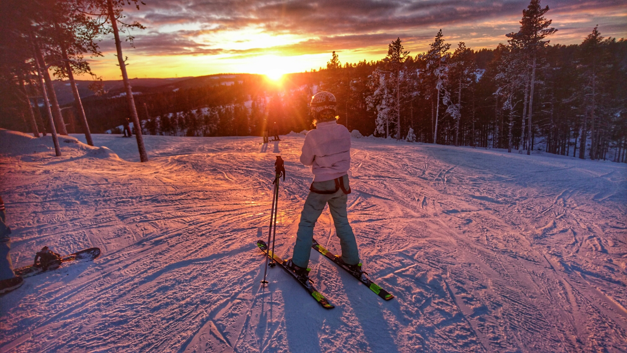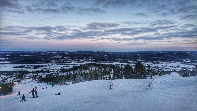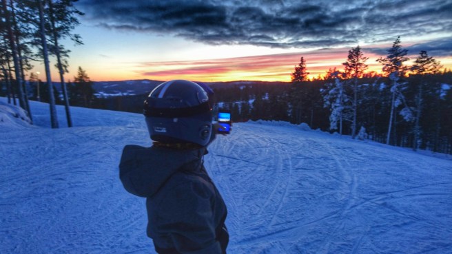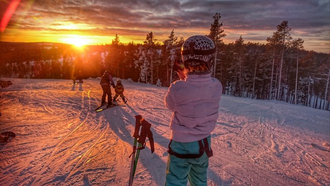 Dagens höjdpunkt blev att få se allas reaktioner när de kom över krönet med liften och fick se den spektakulära solnedgången. Coola snowboardåkare, trötta småkids, irriterade vuxna och uttråkade tonåringar bara tvärstannade, släppte stavar och vantar och plockade fram telefonerna för att fotografera. En del stannade bara för att njuta. Faktiskt!
